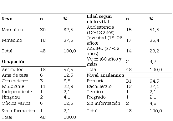 El sexo masculino representó el 62,5 % (n = 30) de los casos, siendo el grupo de juventud (19-26 años) el de mayor frecuencia de suicidios con 68,8 % (n = 33). Respecto al nivel académico, el 64,6 % (n = 31) tenía un nivel de estudio de primaria y el 27,1 % (n = 13) de bachillerato. La ocupación con registro mayor de suicidios era agricultores con 37,5 % (n = 18), seguido de los estudiantes con 22,9 % (n = 11) (tabla 4).