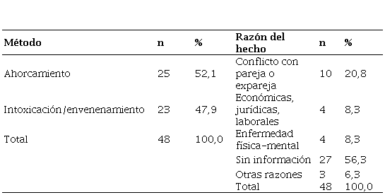 En relación con el método del hecho, se aprecia que la mayor frecuencia está dada por el ahorcamiento con 52,1 % (n = 25), seguido de la intoxicación/envenenamiento con 47,9 % (n = 23). Respecto a las razones del hecho, el 56,3 % de los casos no presentaron información; por otro lado, el conflicto con la pareja o expareja representó el 20,8 % (n = 10); las razones económicas, jurídicas y laborales junto a la enfermedad física-mental representaron el 8,3 % (n = 4) cada una (tabla 5).