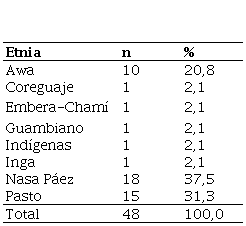 La etnia con mayor frecuencia de suicidios en la región fue la Nasa Páez con 37,5 % (n = 18), seguida de los Pastos con 31,3 % (n = 15) y la Awa con 20,8 % (n = 10). De los 19 suicidas en el departamento del Cauca, el 89,5 % (n = 17) corresponde a la etnia Nasa Páez; para el departamento de Nariño, de los 26 suicidas el 57,6 % (n = 15) corresponde a los Pastos, seguidos de los Awa con 38,4 % (n = 10); finalmente, para el Valle del Cauca, hubo un total de 3 casos representados en la etnias Nasa Páez, Embera-Chamí e indígenas (tabla 6).