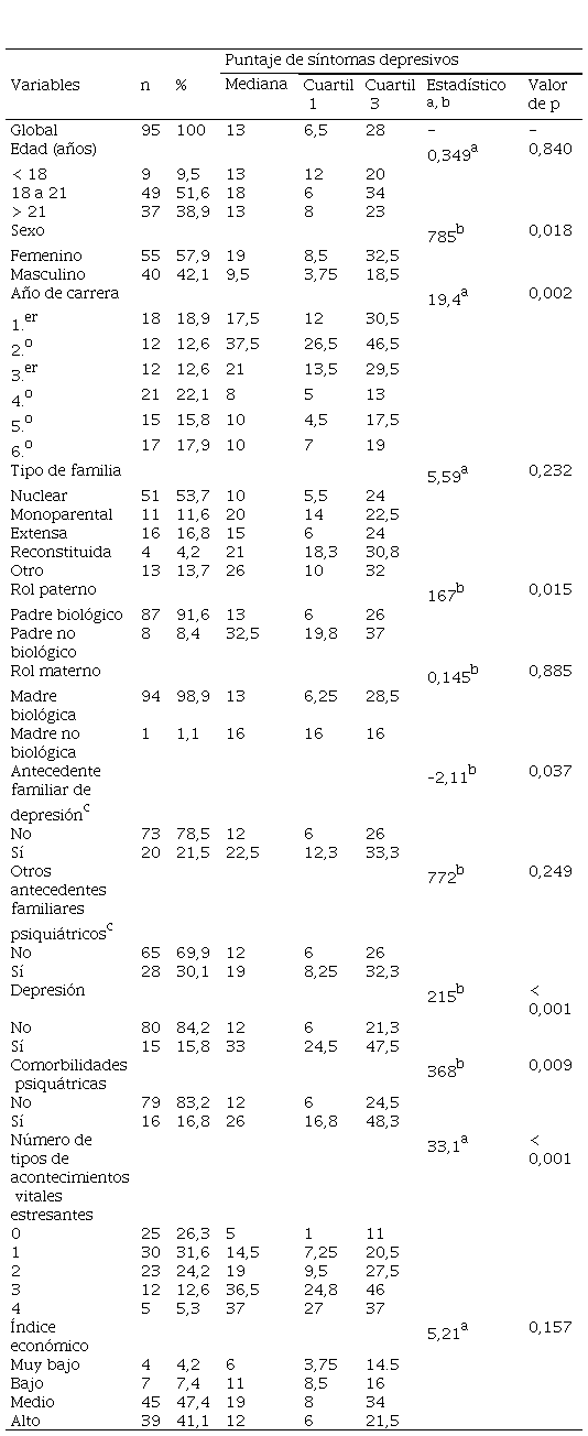La mediana del puntaje de síntomas depresivos para la muestra fue 13; la mitad de la muestra tuvo puntajes entre 6,5 y 28. Encontramos una diferencia estadísticamente significativa entre la mediana de los puntajes de mujeres y varones (19 vs. 9,5; p = 0,018); entre los que tienen padre biológico o no (13 vs. 32,5; p = 0,015); ante la presencia o no de depresión (33 vs. 12; p < 0,001); ante la presencia o no de comorbilidades psiquiátricas (26 vs. 12; p = 0,009); y respecto a la presencia o no de antecedente familiar de depresión (22,5 vs. 12; p = 0,037). De manera similar, hallamos una diferencia estadísticamente significativa por año de carrera (p < 0,002); asimismo, el mayor puntaje de síntomas depresivos lo obtuvo el grupo que pertenecía al segundo año de la carrera (37,5). A más tipos de acontecimientos vitales estresantes (AVE) presentes en las últimas dos semanas, mayor es la mediana de puntaje de depresión (p < 0,001) (tabla 1).