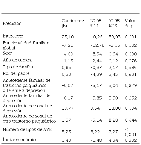 En el análisis de regresión lineal múltiple, la funcionalidad familiar global se comportó como predictor estadísticamente significativo del puntaje del IDB-II (ß = –7,91; p = 0,002). Ajustamos el modelo a sexo, año de carrera, tipo de familia, rol de padre, antecedente familiar de depresión, antecedente familiar de trastorno psiquiátrico diferente a depresión, antecedente personal de depresión, antecedente personal de otro trastorno psiquiátrico, número de tipos de AVE e índice económico. De ellos, solo el antecedente personal de depresión (ß = 10,77; p = 0,004) y el número de tipos de AVE (ß = 5,25; p = 0,001) resultaron estadísticamente significativos (tabla 2).
