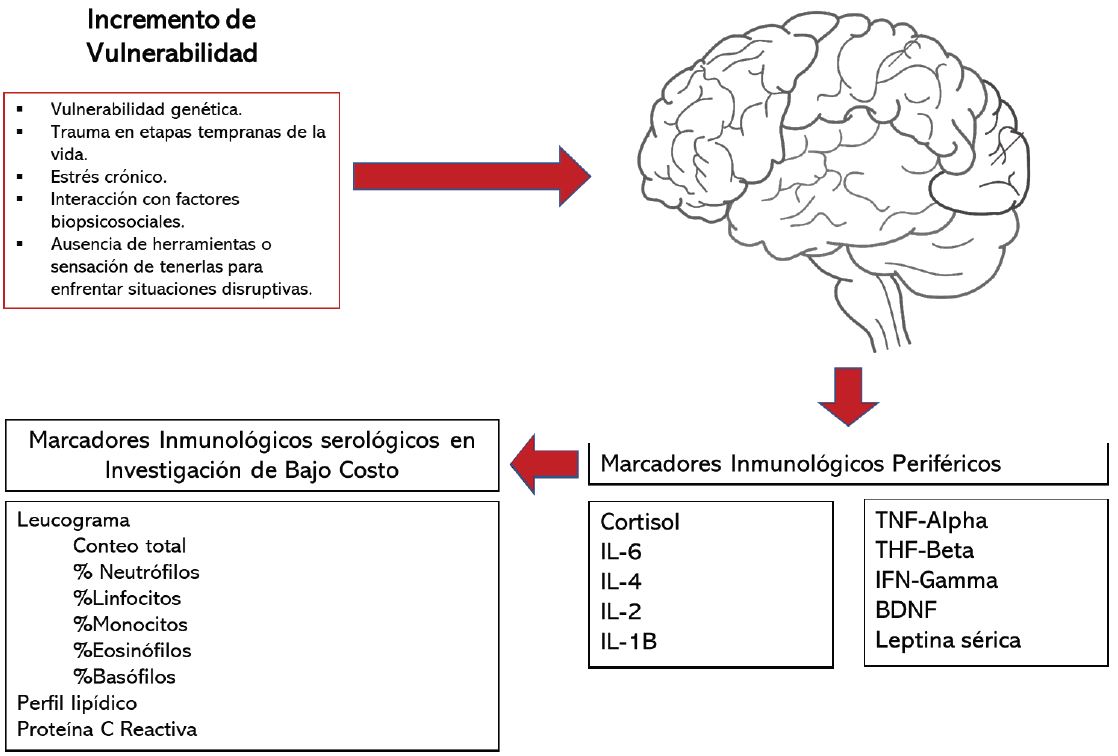 Particularmente, existen pruebas diagnósticas de utilidad en el abordaje de estas patologías. La inflamación en procesos de psiconeuroinmunoendocrinología cumple un papel importante en el comportamiento, en el estrés, ansiedad, depresión, ideación suicida, entre otros. Por esto, existe mucha utilidad en la medición de interleucinas, biomarcadores como el cortisol, proteína C reactiva, perfil lipídico, entre otros. Sin embargo, debido al alto costo de estos estudios en países en desarrollo como el Perú, podemos enfocarnos en pruebas inmunológicas que prometen tener utilidad como una medición indirecta de estos procesos. Ya se ha estudiado otras patologías como la apendicitis, donde la evolución del leucograma y diversos test utilizando los valores leucocitarios son de utilidad para ver la progresión de la enfermedad (11). Estos diferentes biomarcadores se pueden observar en la figura 1.