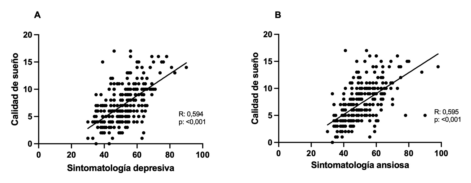 En la evaluación de la relación entre los puntajes de sintomatología depresiva y ansiosa, encontramos que estos tenían correlación directa altamente significativa con los puntajes de calidad de sueño: (R = 0,594; p < 0,001) y (R = 0,595; p < 0,001), respectivamente (figura 2).