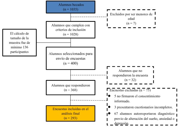 Se enviaron encuestas a 400 alumnos, obteniendo respuesta de 368 de ellos. Luego de la revisión de las encuestas respondidas, se excluyeron 75 por los siguientes motivos: 5 no tenían firma en el consentimiento informado, 3 no llenaron adecuadamente el cuestionario, y 67 correspondían a alumnos con diagnóstico previo autorreportado de trastorno del sueño, ansiedad o depresión. En el análisis final fueron consideradas las encuestas de 293 alumnos (figura 1).