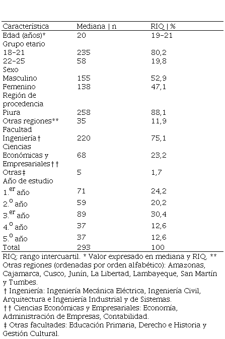 Los alumnos encuestados tuvieron una mediana de edad de 20 años (RIQ 19-21), mayoritariamente fueron hombres (52,9 %), procedían de la región Piura (88,1 %), pertenecían a la Facultad de Ingeniería (75,1 %), y cursaban el tercer año de estudios (30,4 %) (tabla 1).