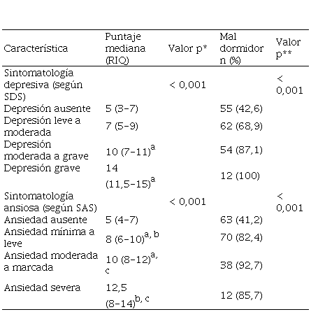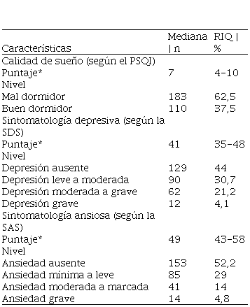 Se encontró que el 62,5 % de los alumnos eran malos dormidores con una mediana de calidad de sueño de 7 (RIQ 4-10); además, se identificó que el 47,8 % y el 56 % presentaban algún grado de sintomatología ansiosa y depresiva, respectivamente. La mediana de la presencia de sintomatología depresiva fue 41 (RIQ 35-48) y la de ansiedad fue 49 (RIQ 43-58) (tabla 2).