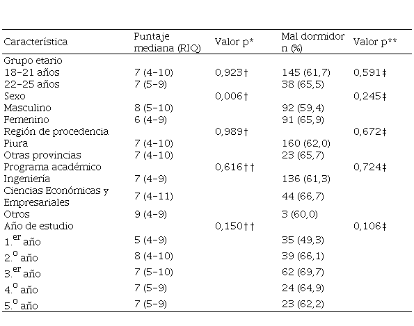 Encontramos una frecuencia de mala calidad de sueño levemente mayor en alumnos de 22 a 25 años (65,5 %), en mujeres (65,9 %), y en los provenientes de regiones diferentes a Piura (65,7 %); asimismo, los puntajes de calidad de sueño solo fueron diferentes entre alumnos según el sexo. Los alumnos de Ciencias Económicas y Empresariales tuvieron el mayor porcentaje (66,7 %) de mala calidad de sueño en comparación con el resto de programas académicos. Más del 60 % de los alumnos de segundo a quinto año presentaron una mala calidad de sueño.