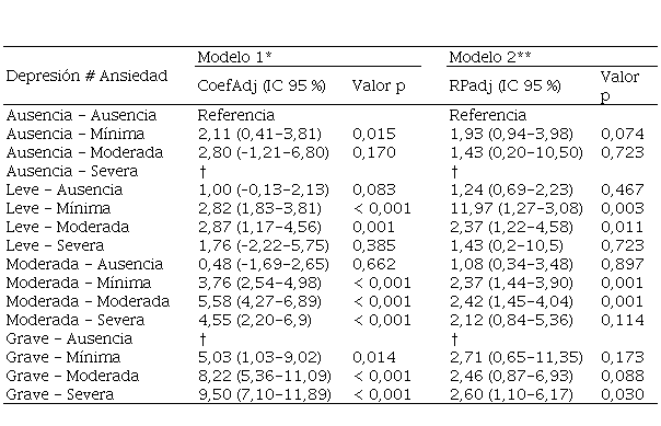 En la determinación de la asociación de los niveles de depresión y ansiedad con la calidad de sueño mediante los modelos con desenlace numérico y categórico, se evidenciaron comportamientos similares en los resultados. De manera puntual, en el modelo para asociación de puntajes, se identificó que el incremento de los niveles de ansiedad cuando no existía depresión promovía un mayor puntaje de calidad de sueño (mal dormidor), resultado que fue significativo cuando se tenía ansiedad mínima respecto a no tener ansiedad (Coef. = 2,11; IC 95 % 0,41-3,81) (tabla 5).