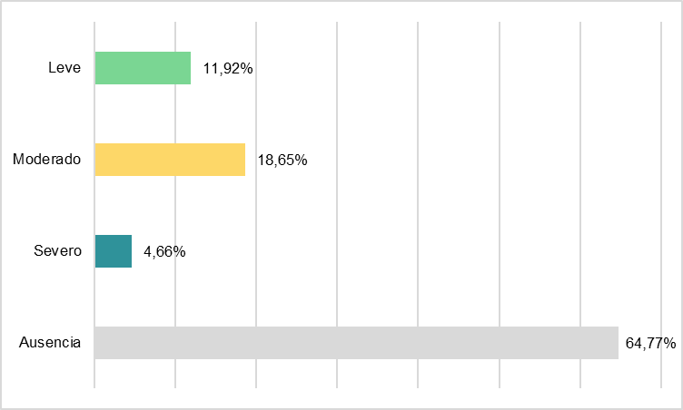 Al aplicar la escala COVID-19-PTSD, se informó una frecuencia de síntomas de TEPT postpandemia en el 35,23 % de los encuestados (n = 68). Entre los participantes con algún grado de síntomas de TEPT, predominó el nivel moderado en el 18,65 % (n = 36), seguido del nivel leve en el 11,92 % (n = 23). Asimismo, 9 estudiantes de Medicina reportaron síntomas de TEPT severos postpandemia de COVID-19 (4,66 %) (figura 1).