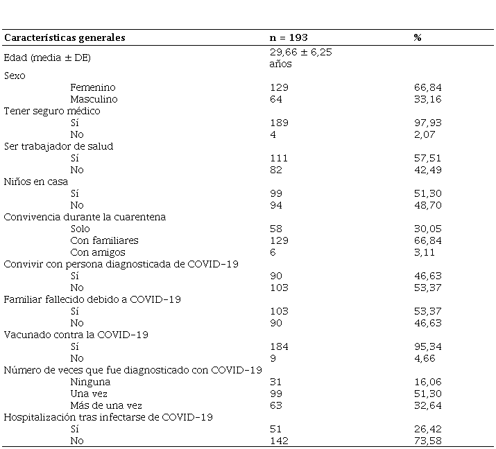 Las características sociodemográficas fueron descritas en la primera sección del cuestionario (edad, sexo, seguro médico y condición de trabajador de salud en el participante). La segunda sección estuvo conformada por las características familiares (presencia de niños en casa, convivencia durante la cuarentena, convivir con una persona diagnosticada de COVID-19 y familiar fallecido a causa de COVID-19). En la tercera sección del instrumento se incluyeron las características relacionadas con la salud en las que se consideró el estado de vacunación contra la COVID-19, el número de veces de diagnóstico de COVID-19 y la necesidad de hospitalización tras el diagnóstico de infección por SARS-CoV-2 en el estudiante de Medicina.
