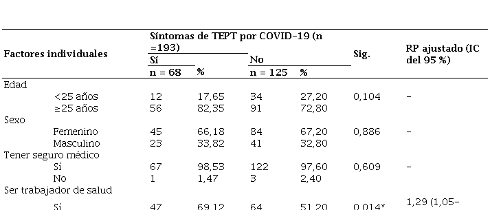 Abstract: Objective: To identify post.COVID.19 pandemic-related factors associated with Post.Traumatic Stress Disorder (PTSD) symptoms in medical students from a private university in Lima, 2023.Methods: Cross.sectional study of 193 medical students implemented through a web.based survey using the COVID.19.PTSD questionnaire. The data were tabulated and analyzed using the version 25 of the statistical software SPSS, and employing prevalence ratios (PR) within a 95% confidence interval (CI). Results: Among the participants, 129 (66,84%) were female, with a mean age of 29,66 ± 6,25 years. Being a healthcare worker was an individual factor associated with PTSD (PR: 1,29; 95% CI: 1,05-1,58; p=0,014). Family.related factors such as having children at home (PR: 1,30; 95% CI: 1,09-1,54; p=0,002), cohabitating with relatives during the quarantine period (PR: 1,90; 95% CI: 1,55-2,33; p<0,001), and living with a person diagnosed with COVID.19 (PR: 2,25; 95% CI: 1,78-2,83; p<0,001) were also associated with PTSD symptomatology. Lastly, having had multiple COVID.19 diagnoses (PR: 1,77; 95% CI: 1,67-1,89; p<0,001) and having been hospitalized for such reason (PR: 2,32; 95% CI: 1,44-3,73; p<0,001) were pandemic.related variables associated with PTSD symptomatology among medical students. Conclusions: The mental health of medical students was significantly affected during the pandemic, suggesting the need for adequate psychological support in future similar circumstances.