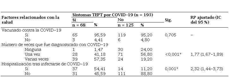 Entre los participantes que presentaron algún grado de síntomas de TEPT por COVID-19, el 57,35 % (n = 39) había sido diagnosticado de COVID-19 varias veces y el 54,41 % (n = 37) requirió hospitalización tras la infección. El análisis inferencial determinó que los alumnos con diagnósticos numerosos de COVID-19 presentaron 1,77 veces mayor probabilidad de presentar síntomas de TEPT postpandemia frente a aquellos que nunca se infectaron (IC del 95 %: 1,67-1,89; p < 0,001). Asimismo, haber sido hospitalizado por gravedad de la COVID-19 otorgó 2,32 veces mayor probabilidad de presentar síntomas de TEPT por COVID-19 entre los estudiantes de Medicina de este estudio (IC del 95 %: 1,44-3,73: p = 0,001) (tabla 4).