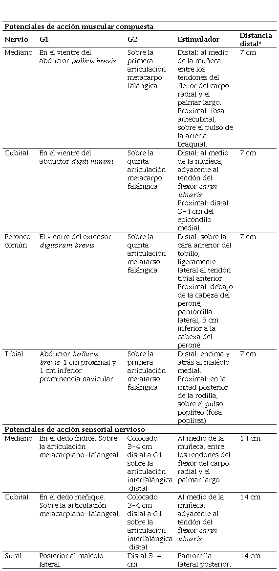 Al participante, en decúbito dorsal sobre una camilla, se le procedió a colocar los electrodos para la evaluación de los distintos nervios, previa limpieza con pasta abrasiva. Se evaluaron las VCN motora de los nervios: mediano, cubital, peroneo común, tibial; así como las VCN sensitiva de los nervios mediano, cubital y sural. Los puntos anatómicos para la colocación de los electrodos de referencia se describen en la tabla 1, los cuales son recomendados por textos de neurofisiología (4) y van en concordancia con las recomendaciones de la AANEM.