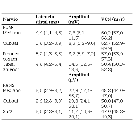 Las latencias de los nervios medianos, cubital y tibial anterior fueron menores de 5 ms, mientras que las de los nervios peroneos fueron mayores de 5 ms. Todas las amplitudes de nervios motores fueron superiores a 5 mV, y las velocidades estuvieron encima de 50 m/s, a diferencia de los nervios sensitivos, donde las amplitudes estaban encima de los 20 μV si eran nervios mediano y cubital, y encima de los 10 μV si eran nervios surales. En todos los casos, las velocidades de nervios sensitivos fueron mayores a 45 m/s. Cuando se evaluó según el género, las latencias, velocidades y amplitudes no difirieron entre hombres y mujeres (p > 0,05).