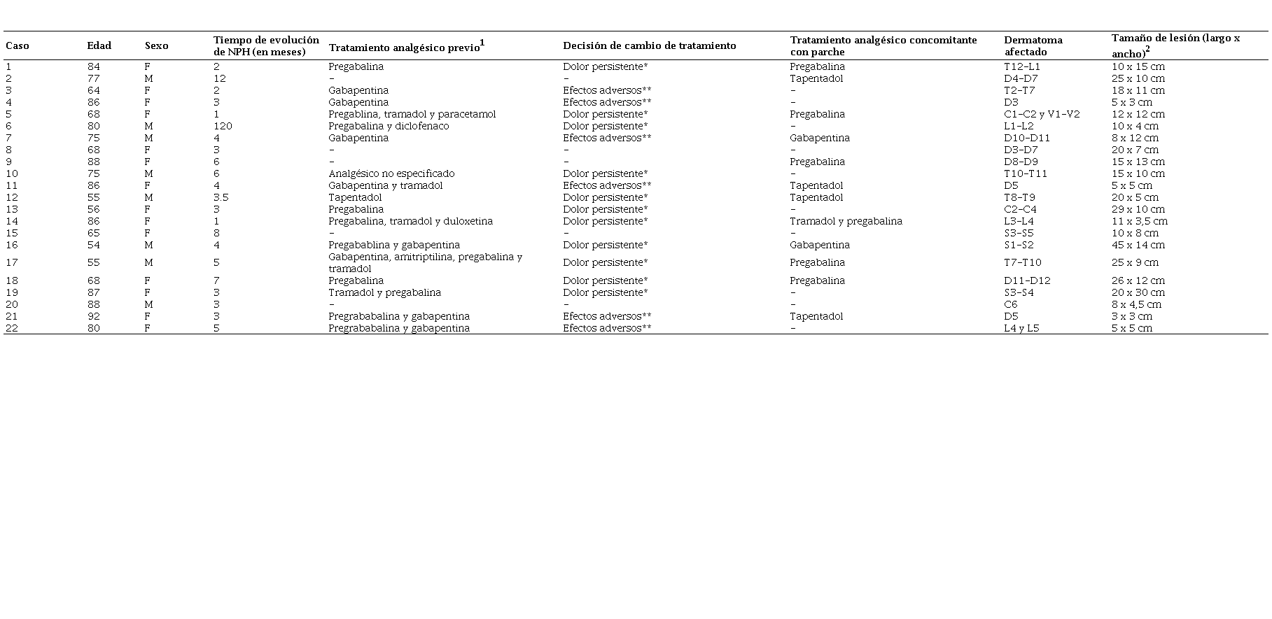 Del total de pacientes, 17 iniciaron la terapia tópica con lidocaína, posterior al tratamiento sistémico por vía oral. En este caso, las principales razones para la decisión de este cambio de tratamiento fueron el dolor persistente (n = 11) y los efectos adversos (n = 6) de la terapia previa. Sin embargo, la mayoría (n = 12) recibió un tratamiento analgésico concomitante al parche, en el que se utilizaron medicamentos como pregabalina, gabapentina y tapentadol (tabla 1).
