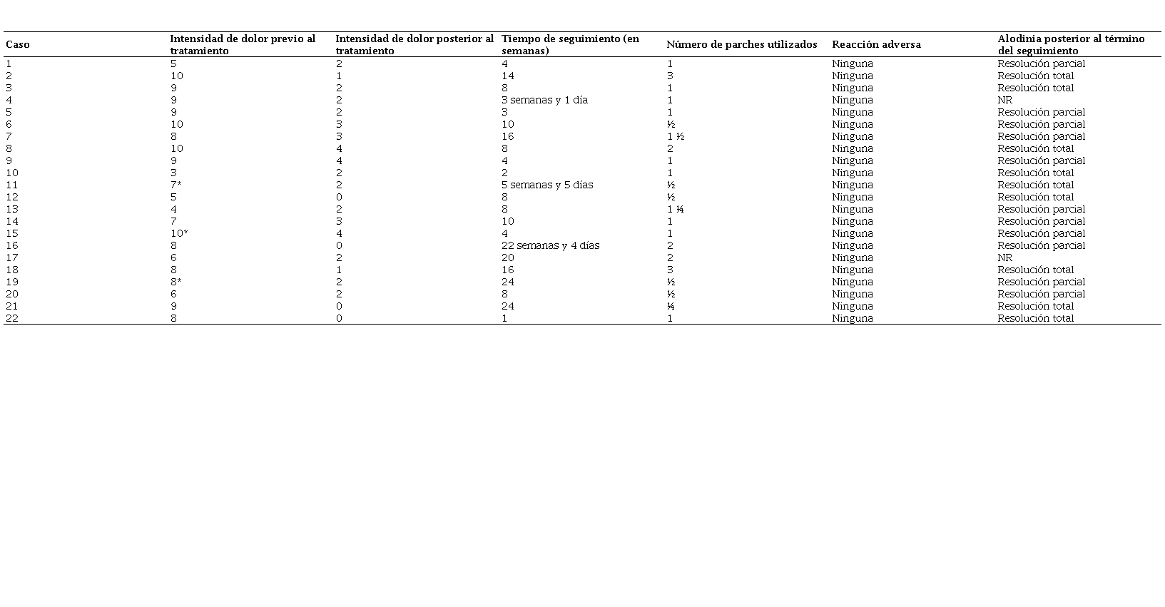 En general, se indicó desde ¼ de parche hasta 3 parches de lidocaína al 5 % como máximo, dependiendo de la longitud de la lesión herpética. De manera previa a la terapia con el parche de lidocaína al 5 %, los pacientes reportaron puntuaciones desde 3 hasta 10 (mediana: 8; rango intercuartílico: 3), según las escalas de medición de dolor. Los puntajes disminuyeron significativamente después del uso del parche de lidocaína (p < 0,01), ya que se observaron puntuaciones desde 0 hasta 4 (mediana: 2; rango intercuartílico: 2), según las escalas de medición de dolor. Al final del seguimiento, ninguno de los pacientes presentó alguna reacción adversa al parche, y solo nueve presentaron una resolución total de la alodinia (tabla 2).