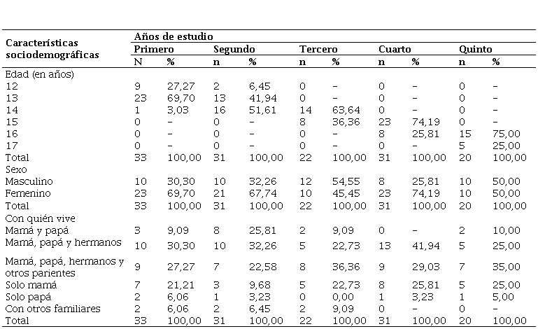 Se evaluó un total de 137 estudiantes de nivel secundaria, principalmente de sexo femenino (n = 87). El rango de edad fue de 12 a 17 años. En la tabla 1 se muestran las características sociodemográficas según el año de estudio. En términos de la configuración familiar, se observó que el 31,4 % vivía con mamá, papá y hermanos, seguido del 29,2 % que vivía con mamá, papá, hermanos y otros parientes.
