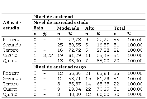En tabla 2, se observa, en todos los años de estudio, que la mayoría de los estudiantes tuvo un nivel de ansiedad que se consideró moderado a alto, tanto para la AE como para la AR, mientras que solo un estudiante señaló un nivel de ansiedad bajo.
