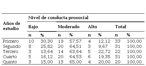 Se obtuvo niveles moderados a altos de conducta prosocial en el 78,8 % (n = 108) de estudiantes, principalmente en los de tercer año, con un 63,64 % de nivel moderado y un 22,72 % de nivel alto. Asimismo, los de quinto año obtuvieron un 65 % de nivel moderado y un 20 % de nivel alto. Estos resultados encuentran similitud con los hallazgos de Balabanian (8), en los cuales los adolescentes se muestran con disposición de ayuda en contextos de emergencia y ante expresiones de miedo y angustia percibidas en las demás personas.