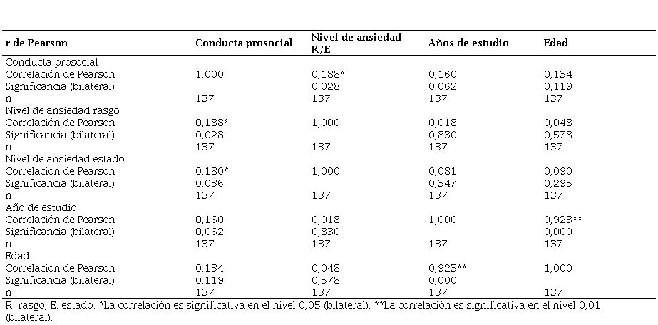 En la tabla 4, se observa la relación entre la AR y la conducta prosocial, con una r de Pearson de 0,188, que indica una correlación positiva muy baja, pero con significancia estadística (p = 0,028). Por otro lado, la correlación entre año de estudio y conducta prosocial (r de Pearson = 0,160) y la correlación entre edad y conducta prosocial (r de Pearson = 0,134) fueron positivas muy bajas y no alcanzaron niveles de significancia estadística. Al relacionar la conducta prosocial y la AE, según años de estudio y edad, se obtuvo un r de Pearson = 0,180, lo cual indicó una correlación positiva muy baja con significancia estadística (p = 0,036).