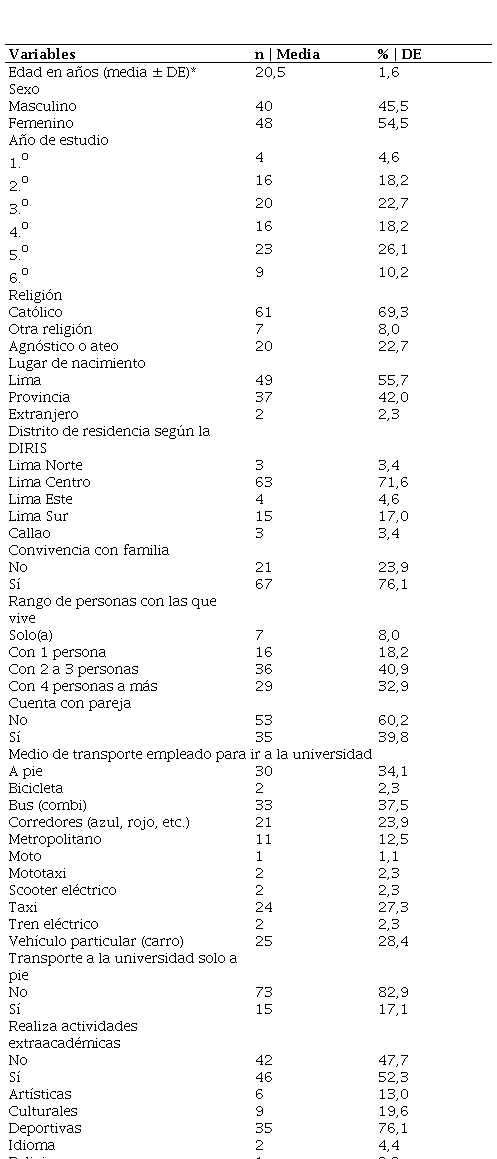 Entre los 88 estudiantes incluidos en la muestra de estudio, se encontró que la edad estaba entre los 18 y 23 años con una media de 20,5 ± 1,6 años; el 54,5 % eran mujeres, con diversa frecuencia según el año de estudio; 69,3 % eran de religión católica; 55,7 % nacieron en Lima; 71,6 % residían en distritos correspondientes a la DIRIS Lima Centro; 76,1 % convivían con su familia; 40,9 % convivían con 2 o 3 personas; 60,2 % no contaban con pareja; 37,5 % empleaban el bus (combi) como medio de transporte a la universidad; el 17,1 % se trasladaba a la universidad solo a pie; y el 52,3 % manifestaba realizar alguna actividad extraacadémica (tabla 1). Las características de los estudiantes que respondieron la encuesta según cada momento de evaluación se presentan en el material suplementario (tabla S1).