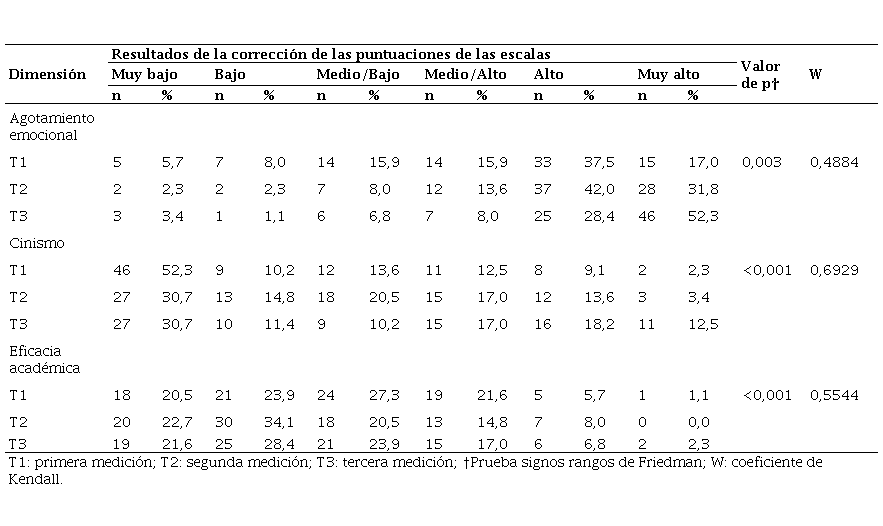 Los cambios en las proporciones de las respuestas del MBI-SS y de las categorías de la corrección de las puntuaciones de las escalas para las dimensiones del SBO, entre los tres momentos de evaluación, se determinaron mediante la prueba de los signos rangos de Friedman; además, la concordancia de dichas proporciones entre los momentos se analizó mediante la prueba W de Kendall.