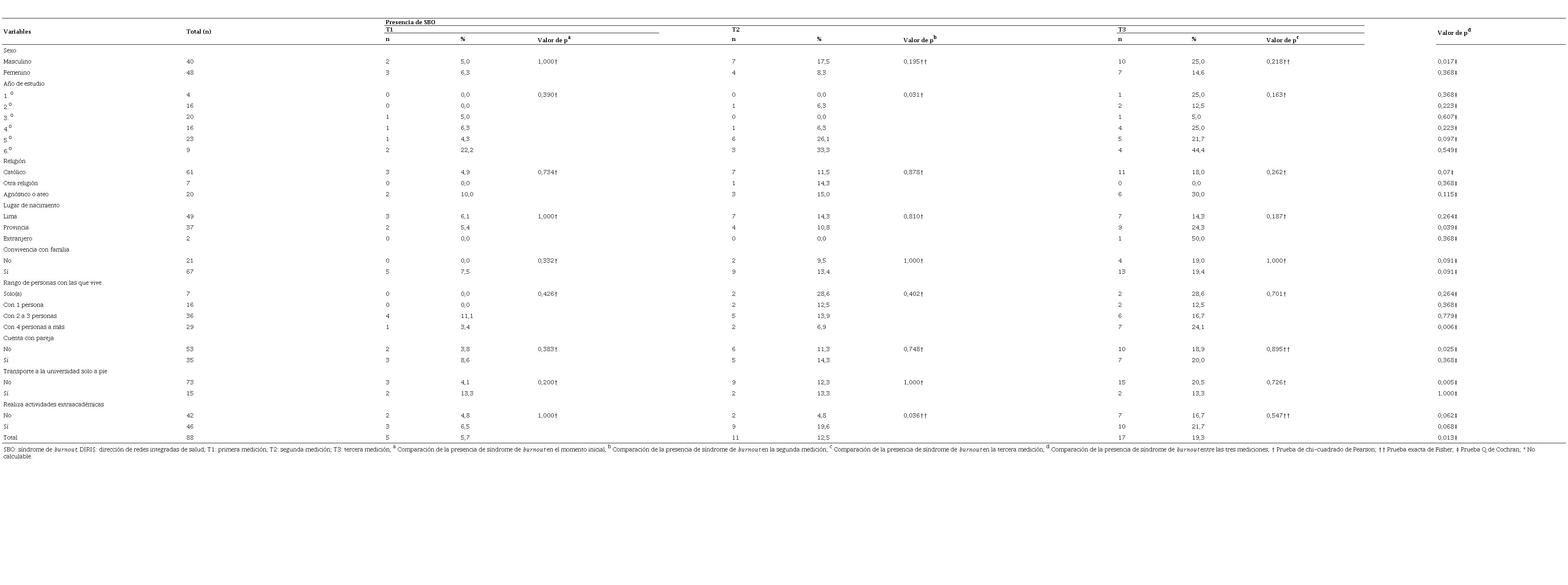 Las características de los estudiantes de Medicina que participaron del estudio fueron, en su mayoría, jóvenes entre 18 y 23 años, de sexo femenino, sin pareja; similar a lo encontrado en otro estudio realizado en Perú sobre el SBO (21). Una característica encontrada en nuestra población es que el 76,1 % vive con su familia, similar a otro estudio en estudiantes de Medicina de sociedades científicas peruanas, encontrando un 86,1 % (26).
