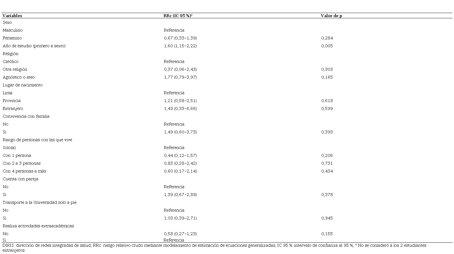 Dado que en la muestra de estudio se tenía 2 estudiantes de origen extranjero, se excluyeron de la exploración de factores asociados debido a que tienen mayor susceptibilidad emocional. Entre los 86 estudiantes incluidos en la evaluación de factores asociados a la presencia de SBO mediante modelo crudo, se identificó que solo el año de estudio incrementaba el riesgo de desarrollar SBO en el tiempo (RR: 1,60; IC 95 %: 1,15-2,22) (tabla 4).