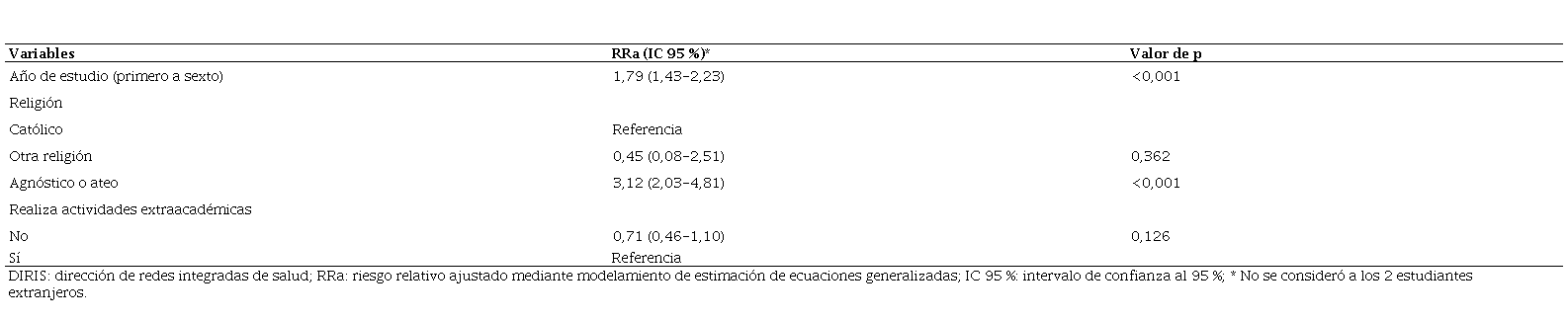 En el modelo ajustado por la realización de actividades extraacadémicas, el año de estudio incrementó la incidencia del SBO (RR: 1,79; IC 95 %: 1,43-2,23). Ello también se presentó en los estudiantes agnósticos o ateos respecto a los católicos (RR: 3,12; IC 95 %: 2,03-4,81) (tabla 5).
