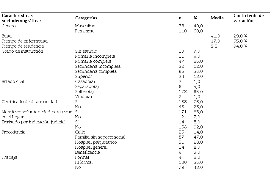 En la tabla 1, se muestra que la mayoría de los residentes fueron mujeres (60,0 %), solteras(os) (94,5 %), con grado de estudio de secundaria (48,0 %) y con edad promedio de 41 años. Las tres cuartas partes de los residentes tenían certificado de discapacidad. Todos tenían documento nacional de identificación. Casi todos los residentes estaban en el hogar protegido de manera voluntaria: solo el 8,0 % fueron admitidos por orden judicial. Gran parte de los admitidos procedían de hospitales psiquiátricos en larga estancia hospitalaria y de familias sin soporte social (75,0 %). Finalmente, los residentes tenían en su mayoría trabajo informal (55,0 %).