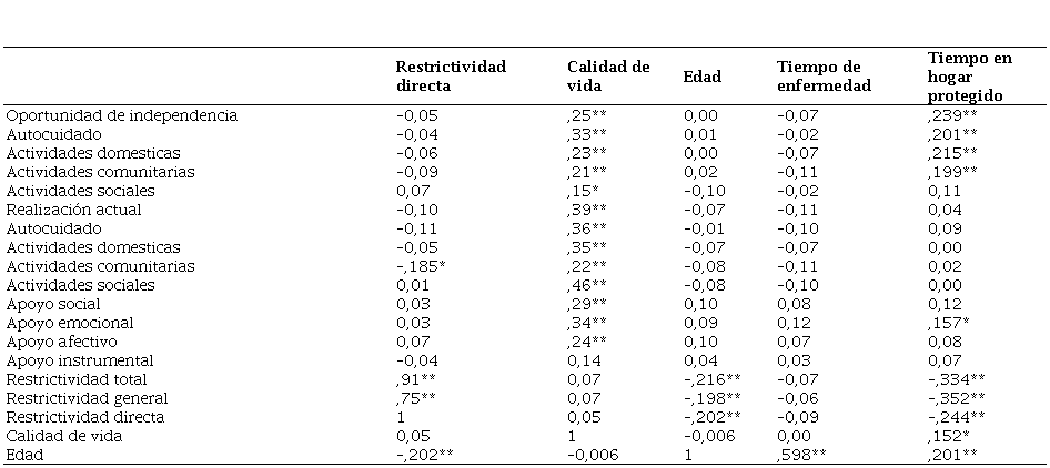 En la tabla 2 se presenta la matriz de correlación entre las variables. En esta matriz se observa que la restrictividad directa tiene una relación negativa y significativa con la edad (r = –0,202; p < 0,01) y el tiempo en hogar protegido (r = –0,244; p < 0,01), pero no con la calidad de vida (r = 0,05; p > 0,05). La calidad de vida muestra correlaciones positivas y significativas con los indicadores de habilidades básicas de la vida diaria (autocuidado - actividades sociales), así como las diversas formas de apoyo (emocional, afectivo e instrumental), siendo las más fuertes con las actividades sociales (r = 0,46; p < 0,01), realización actual (r = 0,39; p < 0,01) y autocuidado (r = 0,36; p < 0,01). La edad tiene una correlación negativa y significativa con la restrictividad general y directa, pero una correlación positiva con el tiempo de enfermedad (r = 0,598; p < 0,01) y el tiempo en hogar protegido (r = 0,201; p < 0,01). Esto significa que, a medida que se incrementa la edad y el tiempo en el hogar protegido, la restrictividad directa y general disminuye. Por otro lado, a mayores valores de habilidades básicas de la vida diaria y apoyo social, presentan mayor calidad de vida.
