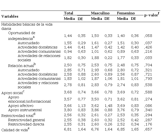 Se observó que los varones obtuvieron mayores oportunidades para desarrollar las habilidades de la vida diaria en las subescalas de autocuidado y relaciones sociales, en comparación a las mujeres, lo que indica la necesidad de intervenciones que consideren el enfoque de género.