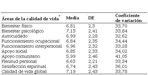 La calidad de vida promedio fue de 7,19 puntos con una variabilidad considerable de 34,0 % respecto al promedio. Las dos áreas que tuvieron mayor puntaje promedio fueron bienestar psicológico (7, 3) y autocuidado (6,99), y las dos áreas con menor puntaje promedio fueron plenitud personal (6,63) y apoyo comunitario (5,99) (tabla 4).
