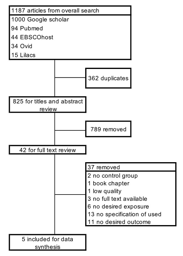 After removing duplicates, we evaluated 875 unique titles and abstracts. Of these, 42 articles were selected for full-text review. Ultimately, only 5 articles met all inclusion criteria. Figure 1 depicts the study selection process.