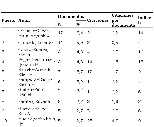 La tabla 1 muestra los autores que lideran la producción científica en la RNP. Mario Reynaldo Cornejo-Olivas lidera la lista con el mayor número de documentos, en total 12 (6,4 %); además, es el autor con mayor índice h. Sin embargo, Jeff Huarcaya-Victoria es el autor con mayor impacto (4,6 citaciones por documento). Además, la figura 2 muestra que la mayoría de la producción y citaciones de estos autores se encuentran antes del 2022.