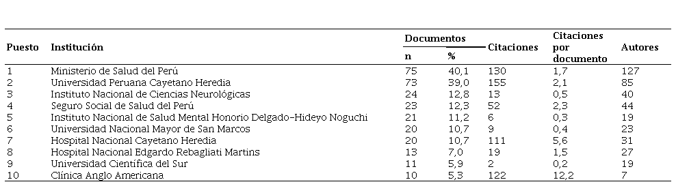 Las 10 instituciones con el mayor número de documentos se muestran en la tabla 2. Las pertenecientes al Ministerio de Salud del Perú fueron las más productivas, con casi la mitad de las publicaciones. Sin embargo, la Clínica Anglo Americana fue la que obtuvo mayor impacto (12,2 citaciones por documento), seguida por el Hospital Nacional Cayetano Heredia (5,6 citaciones por documento). Por otro lado, al desglosar las instituciones, la Universidad Peruana Cayetano Heredia lidera la producción en todos los años de estudio (figura 4).