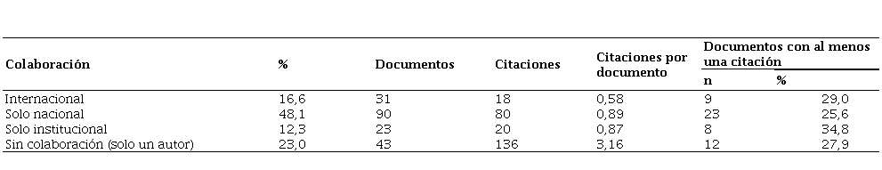 La tabla 3 muestra el tipo de colaboración en la RNP. La mayoría de los documentos recuperados tuvieron colaboración nacional (90 artículos; 48,1 %), seguido de artículos sin colaboración (43 artículos; 23,0 %) e internacional (31 artículos; 16,6 %). Aquellos artículos sin colaboración fueron los de mayor impacto (136 citaciones; 3,16 citaciones por documento) y cabe señalar que 97 citaciones correspondieron a un solo artículo sin colaboración (7).