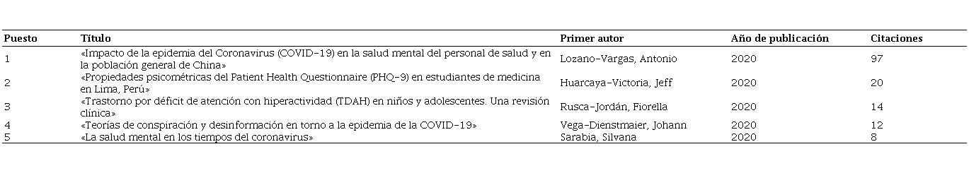 Los cinco artículos con el mayor número de citaciones se muestran en la tabla 4. El artículo más citado fue «Impacto de la epidemia del Coronavirus (COVID-19) en la salud mental del personal de salud y en la población general de China» con 97 citaciones (7).