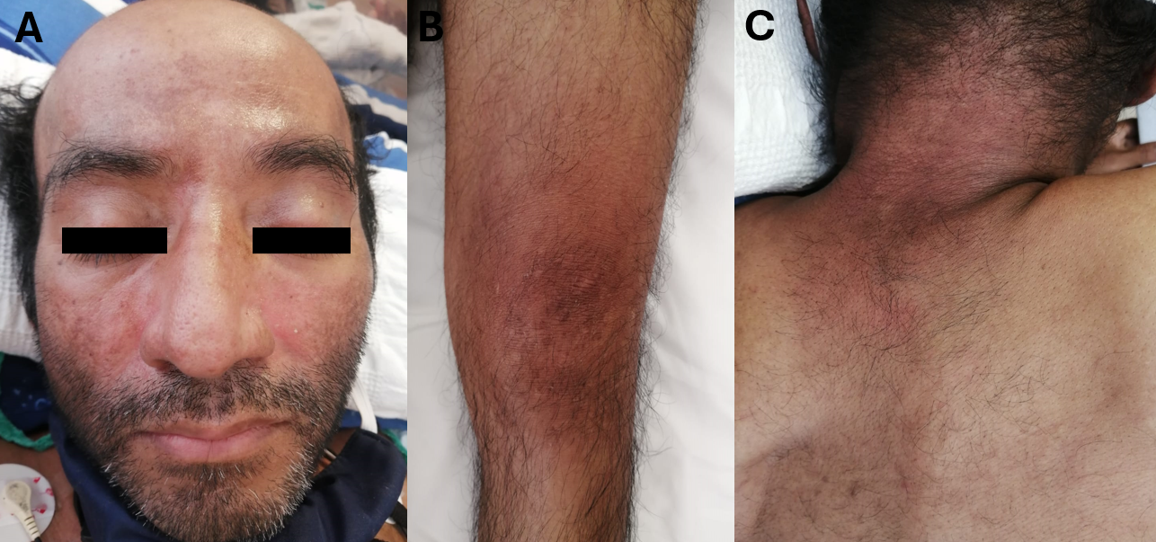 Figure 1. Dermatological findings in the patient. A) Facial erythema. Perinasal centripetal facial erythema and peripheral hyperpigmentation in the facial region. B) Gottron’s sign. Macules and erythematous patches on the extensor surface of the knee joint. C) Shawl sign. Photodistributed erythematous poikiloderma in the upper back and neck.