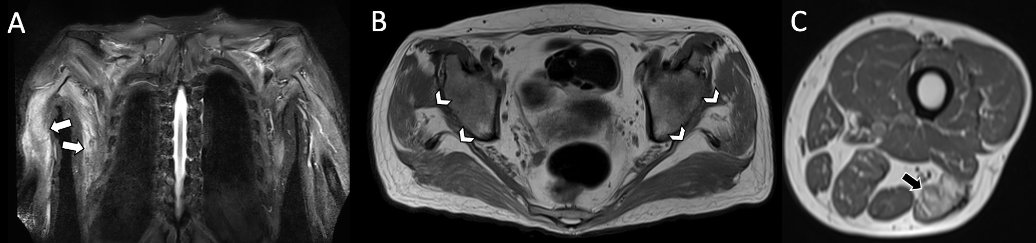 Figure 2. MRI without contrast. A) Coronal fat-saturated T2-weighted image of the shoulder girdle shows diffuse edema of the muscle groups, most evident in the right triceps and latissimus dorsi muscles. B) Axial T1-weighted image without fat saturation of the pelvic girdle shows atrophy and fat replacement of the muscle groups, most evident in the gluteus medius and maximus muscles on both sides. C) The lower sections also show atrophy and fatty replacement of the posterior muscular compartments of both thighs, most evident in the long head of the left biceps femoris.