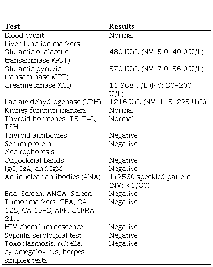 An electromyography study was conducted, which showed normal conduction velocity, decreased amplitude in the motor action potential, normal amplitude in the sensory action potential of the nerves, early interference pattern, signs of abundant denervation with predominance of proximal muscles, and polyphasic motor units of small amplitude. The final diagnosis was severe myopathy with signs of active denervation.