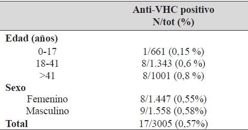 De las 3005 muestras, 76 muestras resultaron inicialmente reactivas: 17 positivas y 59 con valor indeterminado (en la franja del 10% por debajo del valor umbral de positividad). Estas 59 muestras resultaron negativas cuando fueron evaluadas por un segundo ensayo comercial y negativas para la presencia del ARN viral. De este análisis se concluye que la prevalencia de infección o exposición al VHC fue de 0,57 % (17/3005) (Tabla I). No se observaron diferencias significativas en la prevalencia de anticuerpos anti-VHC en función del sexo. Se observó una tendencia a una mayor prevalencia de exposición al VHC en el grupo de pacientes con edades mayores a los 41 años (0,8 %) con respecto a los menores de 18 años (0,15 %), aunque esta diferencia no alcanzó significancia estadística.