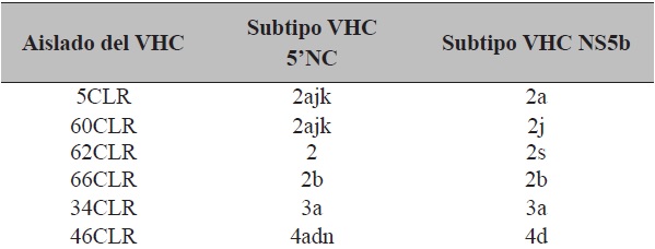 El análisis y la distribución de los genotipos y subtipos del VHC se realizó por amplificación de las regiones 5´NC y NS5B del ARN del virus de la hepatitis C por RT-PCR. Se logró amplificar por la región 5´NC 16 muestras de las 17 con evidencia de exposición al VHC (94 %). Los análisis con el programa BLASTN v2.0.8 y los análisis filogenéticos por el programa DNAman de esta región, evidenciaron que el genotipo 2 fue el más frecuente (56%, 9/16) en los individuos infectados, seguido por el genotipo 1 (31 %, 5/16), hallándose igualmente un genotipo 3 y uno 4 (Tabla II, Fig. 1). El análisis filogenético de 6 muestras para las cuales se logró la amplificación de la región NS5b permitió obtener con mayor definición los subtipos de las mismas (Fig.2), encontrándose una diversidad de subtipos dentro de los aislados genotipo 2 (2a, 2j y 2s) (Fig. 2, Tabla III).
