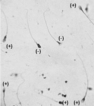 se determi nó usando el colorante comercial Sperm stain™-Fertipro nv, en un fino frotis con semen sin diluir, considerándose positivos aquellos que mantenían el acrosoma intacto y negativos aquellos que no presentaban membrana acrosomal externa porque habían tenido reacción prematura del acrosoma (Fig. 1). El recuento celular se llevó a cabo, por duplicado, en 200 células en cada paciente (24).