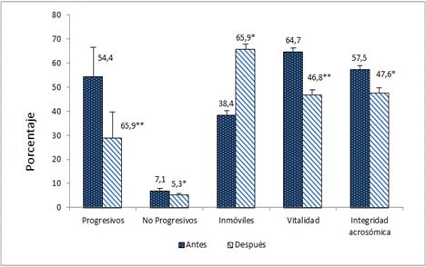 Después del proceso congelamiento-descongelamiento de las muestras sometidas a criopreservación se observó una disminución significativa de la movilidad espermática en las siguientes categorías: Progresivos PR: (54,4 ± 15,4 a 28,9 ±14,9; p ≤ 0,05); No-progresivos NP: (7,1 ± 3,9 a 5,2 ±3,1; p ≤ 0,05); Vitalidad: (73,6 ± 11,1 a 46,8 ±11,1; p ≤ 0,05), e Integridad del acrosoma: (57,4,6 ± 17,5 a 47,6 ±15,9; p ≤ 0,005). Estos resultados reflejaron, simultáneamente, un aumento de los espermatozoides inmóviles (IM). (Fig. 2).