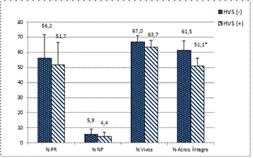 En la Fig. 3 se muestran los valores promedio de movilidad (progresiva y no progresiva) y la vitalidad en los grupos HVS(+) y HVS(-) entre los cuales no se observaron diferencias; no obstante, al evaluarse la integridad del acrosoma (Spermac stain) se encontró que en las muestras HVS(+) fue más baja que en las muestras HVS(-) (p≤0,005).
