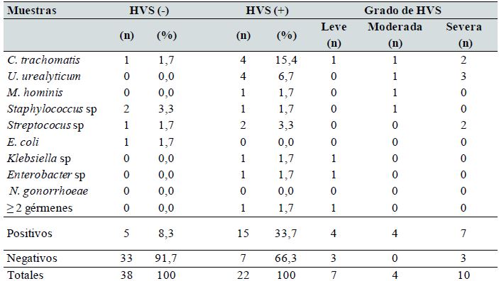 Con respecto a la frecuencia de la HVS de las 60 muestras analizadas, 22 de estas (36,6%) mostraron hiperviscosidad HVS(+), mientras que 38 muestras (63,4%) tenían viscosidad nula HVS(-). En 22 muestras con HVS(+) se identificaron microorganismos en 15 casos, siendo C. trachomatis y U. urealyticum los gérmenes más frecuentes; en las 38 con HVS(-) se identificaron microorganismos en 5 casos, siendo más frecuente la presencia de Staphylococcus sp (Tabla I).