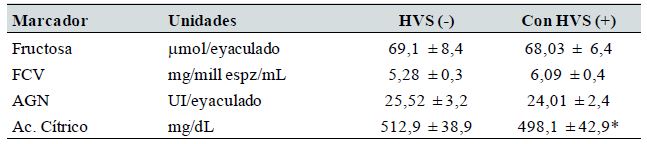 Al comparar los marcadores bioquímicos glandulares en los grupos con y sin hiperviscosidad, no se observaron diferencias entre los grupos con respecto a los marcadores de vesículas seminales (fructosa y FCV) ni en las de epidídimo El ácido cítrico (marcador de próstata) fue el único marcador glandular que se encontró significativamente inferior en las muestras con HVS (p≤0,002) (Tabla II).