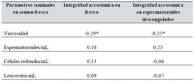 En este estudio se demuestra una relación inversa entre la viscosidad seminal e integridad acrosómica y movilidad en las muestras pre congeladas; es decir, a mayor viscosidad menor integridad acrosómica y menor cantidad de espermatozoides progresivos, por lo tanto se puede considerar el efecto deletéreo de la viscosidad seminal sobre la calidad del semen, la fisiología espermática y posiblemente sobre su capacidad fecundante; de manera que las muestras con viscosidad elevada cualquiera sea su causa deben considerarse inapropiadas para la criopreservación y las demás técnicas de reproducción asistida.