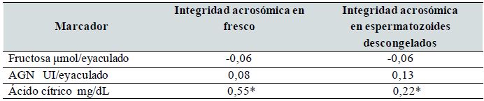 En cuanto a los marcadores de las glándulas accesorias y su relación con la integridad acrosómica, se encontró que el marcador bioquímico de vesículas seminales, fructosa, no guardó relación con la integridad del acrosoma en semen recién eyaculado ni después de ser descongelado; los niveles de ácido cítrico (marcador de próstata) si mostraron relación significativa con la integridad del acrosoma en espermatozoides frescos y descongelados. Con respecto a la actividad de la α-glucosidasa neutra, ésta no guardó relación con la integridad acrosómica antes ni después del proceso de criopreservación (Tabla IV).